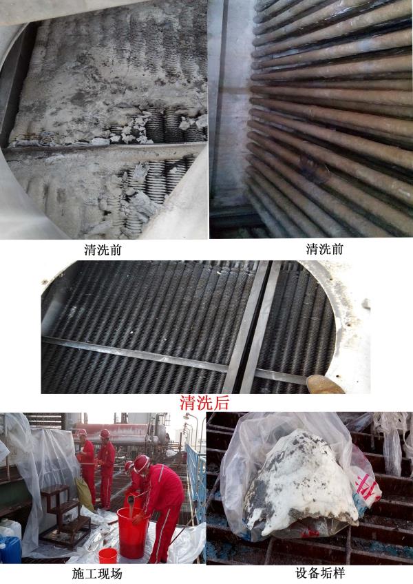 復(fù)合型蒸發(fā)式冷卻器上部是風(fēng)冷式,下部為水冷式。因此上部翅片管束表面由于接觸環(huán)境大氣、易于積存油膩、塵垢、煙垢、柳絮等附著物,形成較大的熱阻,污垢的存在將大大降低甚至喪失鋁翅片冷換設(shè)備的冷卻作用。另外鋁翅片表面的污垢也會(huì)促使垢下腐蝕。下部水冷式光管表面由于外部環(huán)境條件影響,并且由蒸發(fā)式空冷器的特點(diǎn),造成循環(huán)冷卻水濃縮快,濃縮倍率高,硬度,堿度高,濁度高等困難。在長(zhǎng)期運(yùn)行過程中,空冷器光管束表面生成了很厚的硬垢,嚴(yán)重影響了空冷器換熱效果,增加了能耗,影響了正常生產(chǎn)和安全。為了保證設(shè)備安全,穩(wěn)定運(yùn)行,延長(zhǎng)使用壽命,提高冷卻效率,應(yīng)對(duì)其進(jìn)行定期清洗。